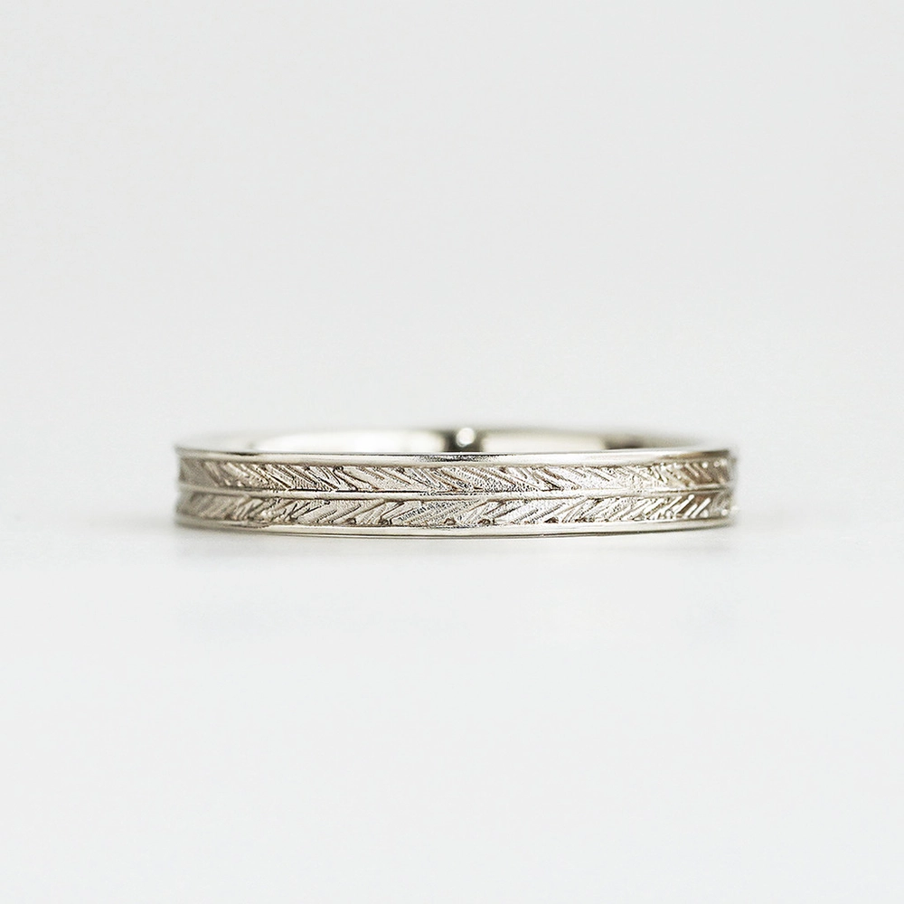 The 'Feather' collection’s wedding band features a feather pattern created using a special technique, offering a classic yet sophisticated image. The subtle and intricate sparkle reveals its beauty when worn.